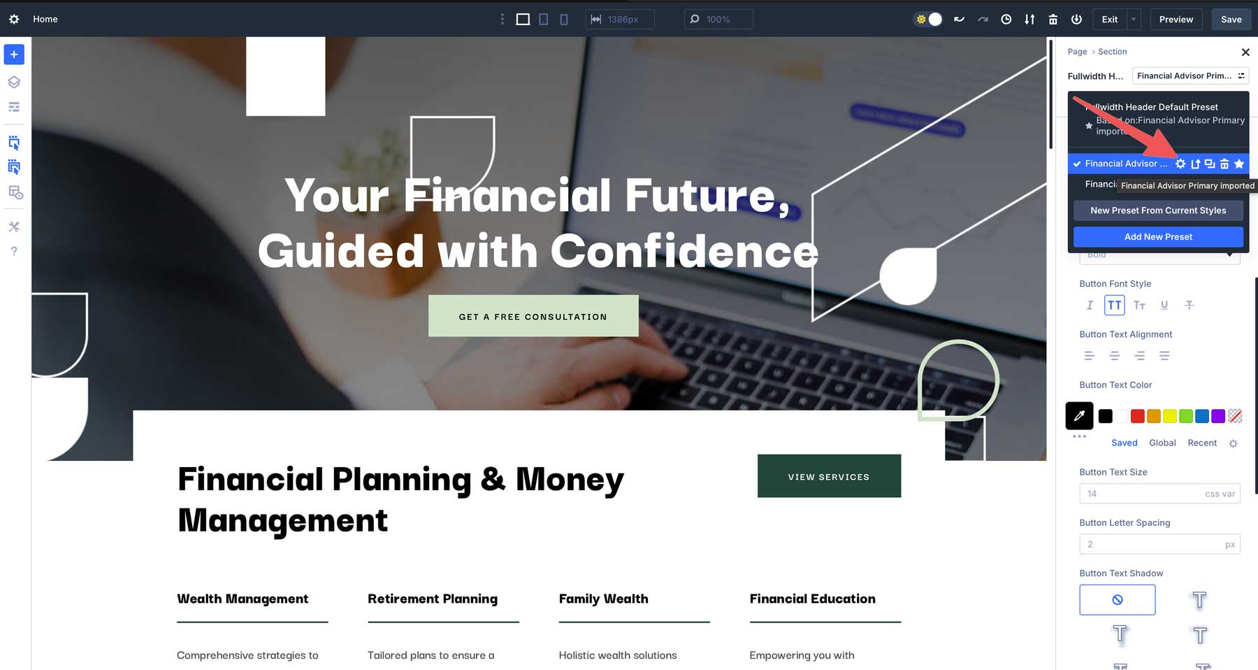 Next, head to the Visual Builder, open the Fullwidth Header module on the home page, and select the Financial Advisor Primary element preset to edit it.
